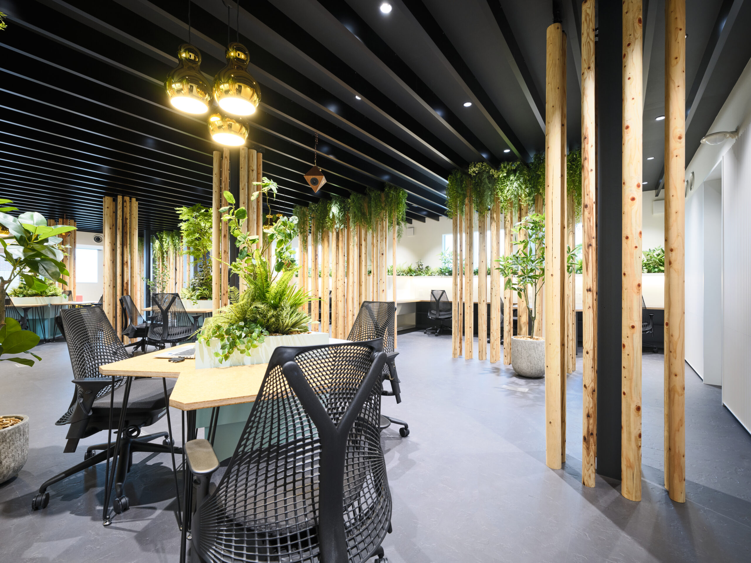 新オフィスは、木立に包まれた小さな森のようなオフィスをイメージし、